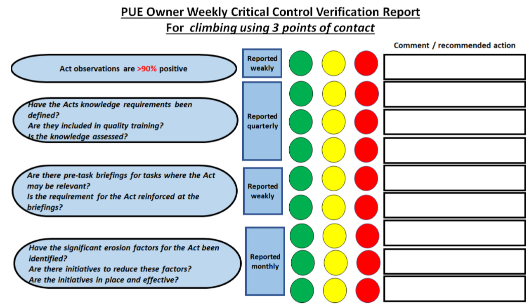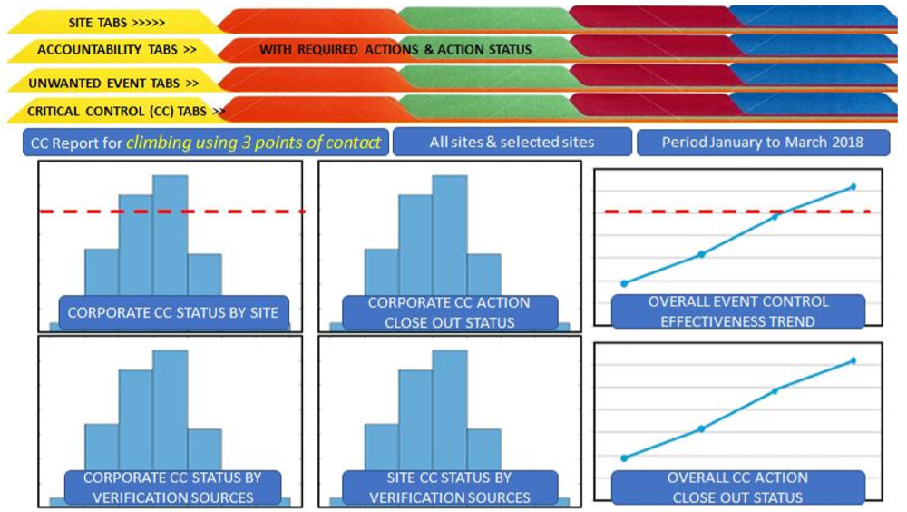 The illustration below suggests an ownership model to set accountabilities for critical control verification and reporting. A site or company identifies several priority unwanted events (PUEs) that are included in their CCM initiative. Each of the PUEs is assigned to an owner. The owner is usually a line manager with responsibilities that include the activities where the PUE could occur. For example, at a site level the production manager could be the owner of a PUE related to vehicle collisions. If the CCM initiative is managed at the corporate level the vehicle collision PUE might be owned by a production executive.