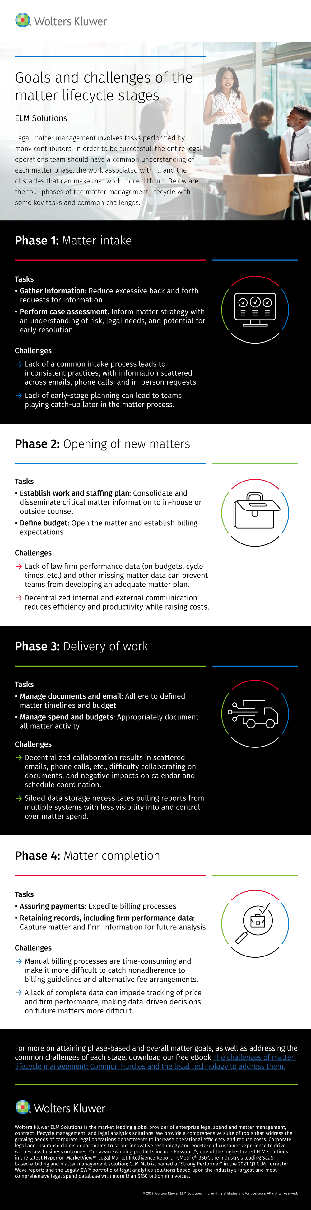 Get the infographic for the four phases of the matter management lifecycle with some key tasks and common challenges.