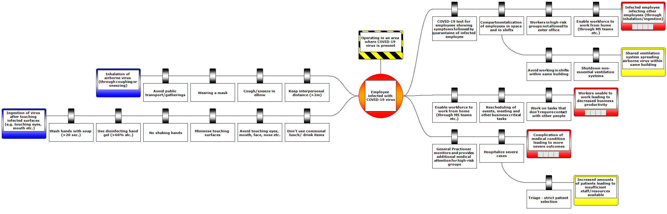 The bowtie below is one example of how infection with COVID-19 and further spreading can occur and develop. This bowtie’s scope is to look at it from the angle of a business. The “hazardous activity” (yellow and black box) is operating in an environment where the virus is present, which is potentially most of the world at the moment. The central node below it, the top event, describes the point in time we lose control over the hazard. In this bowtie, an employee getting infected would be that point. The left side of the diagram shows the threats (or causes) in blue boxes. They describe how the infection can occur. The red boxes on the right visualize the potential unwanted outcomes (consequences) from having a top event. Safety measures, also called barriers, are situated on the scenario lines. They have a specific preventive, controlling or mitigating effect on the scenario line they sit on. We have opted to combine barriers from the World Health Organization (WHO) with some of the best practices we have heard companies implement around us.