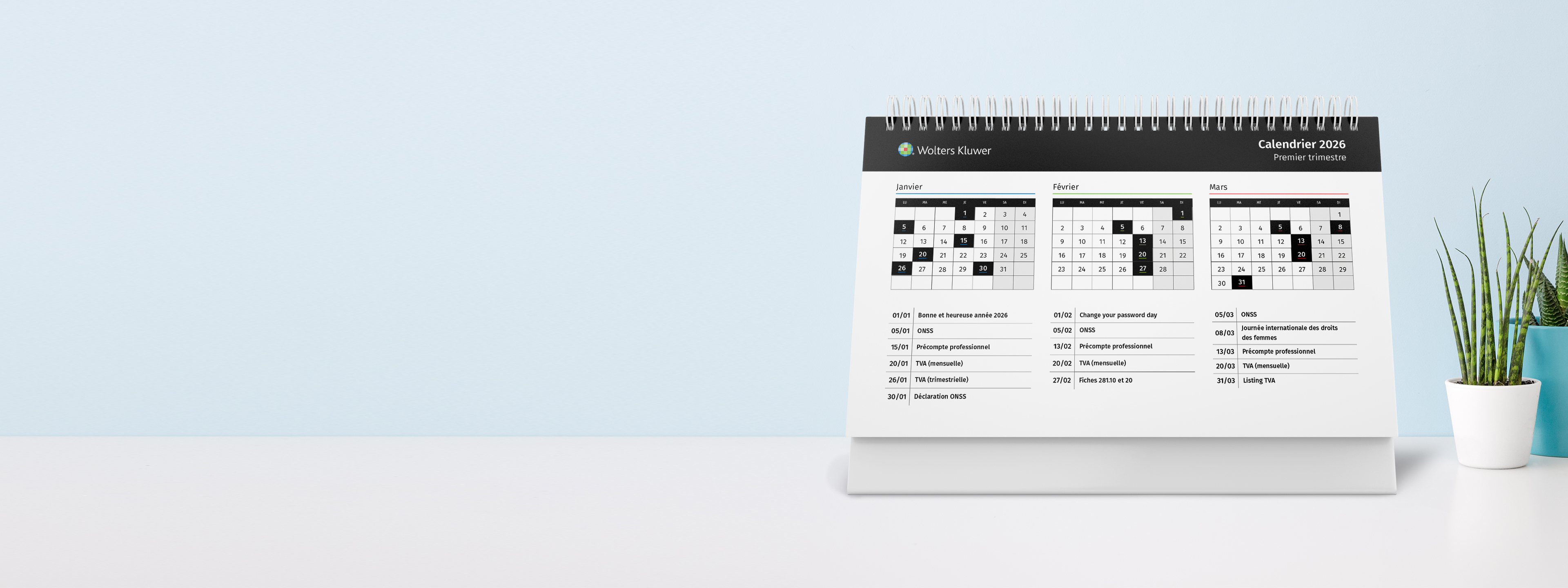 Wolters Kluwer a conçu pour vous le Calendrier fiscal 2026. Il regroupe en un seul document toutes les échéances fiscales et comptables importantes de l'année à venir. La nouveauté sympa ? Une explication détaillée pour chaque date clé. Ainsi, vous savez ce qui vous attend et vous profitez d’une plus grande sérénité, d’une meilleure vue d’ensemble et d’un contrôle renforcé.