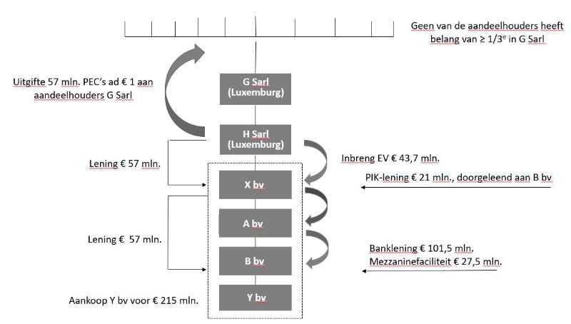 De belanghebbende is een fiscale eenheid aan wie ten behoeve van de aankoop van een Nederlandse groep een lening is verstrekt door haar Luxemburgse moedermaatschappij. De moedermaatschappij heeft de lening gefinancierd door uitgifte van zogenoemde preferred equity certificates (PEC’s). De PEC’s zijn genomen door subfondsen van een private-equity-fonds. In dat fonds wordt deelgenomen door institutionele beleggers. De beleggers zijn ook aandeelhouder van belanghebbendes grootmoedermaatschappij. Geen van de PEC’s-houders heeft meer dan een derde belang in de belanghebbende, direct of indirect. Vereenvoudigd kan de overnamestructuur als volgt worden weergegeven: