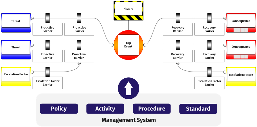 In any angle concerned with risk management, bowtie offers a fixed framework that creates overview. Using the power of its capacity to hit the right spot in terms of complexity, it is both easy to understand, as well as comprehensive in covering every risk scenario (see figure 1 below). Considering different risk situations (e.g. operational, but also enterprise level), while using the method as a thorough means of doing your analysis, will give you a maximum scope to cover your objectives.